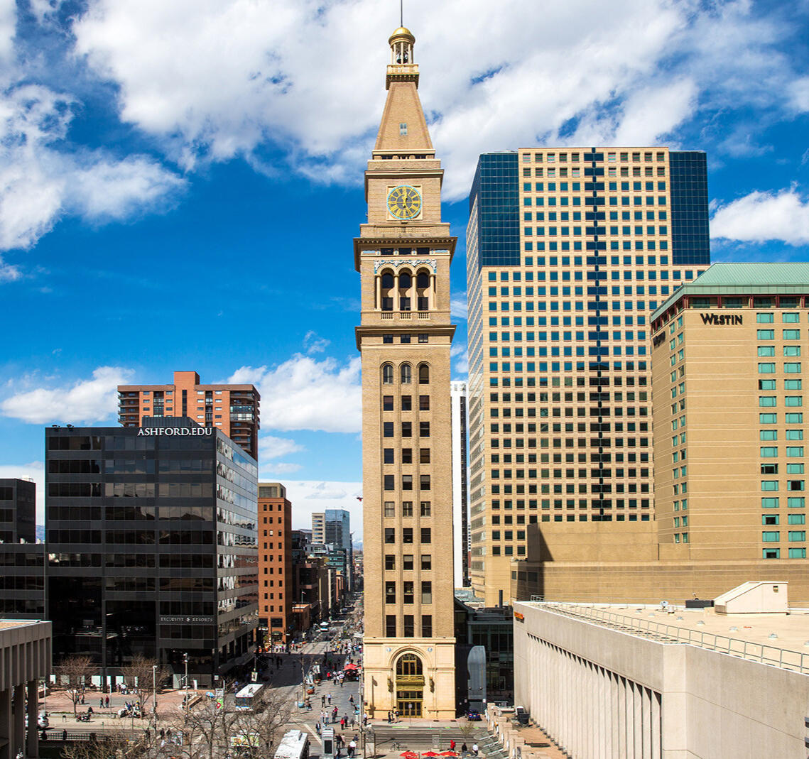 The Daniels & Fisher (D&F) Clock Tower, built in 1910, was once the tallest structure between the Mississippi River and California, standing at 325 feet. Designed by architect Frederick Sterner, its iconic structure was modeled after St. Mark's Bell Tower in Venice, Italy. With clock faces on all four sides and a 2½ ton bell occupying the top two floors, the tower remains a striking symbol of Denver’s architectural history.The D&F Clock Tower was listed on the National Register of Historic Places in 1969, ensuring its legacy as one of Denver’s most treasured landmarks.
